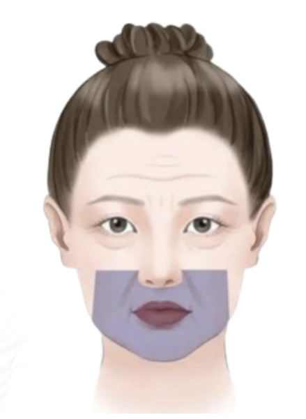 口周區(qū)域包含了我們的鼻翼、嘴唇、口角、下巴、鼻唇溝、木偶紋以及下巴與下頜線銜接過渡區(qū),也就是如圖上的陰影區(qū)。