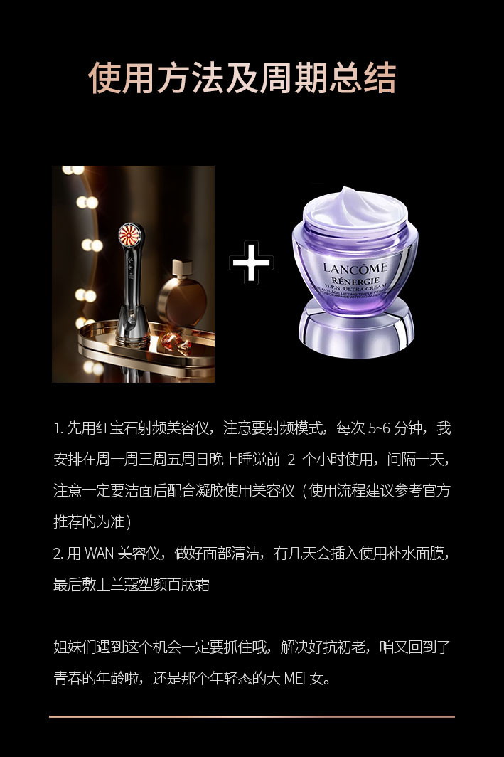 2.用完美容儀,做好面部清潔,有幾天會插入使用補(bǔ)水面膜,最后敷上蘭蔻塑顏百肽霜 姐妹們遇到這個機(jī)會一定要抓住哦,解決好抗初老,咱又回到了青春的年齡啦,還是那個年輕態(tài)的大美女。