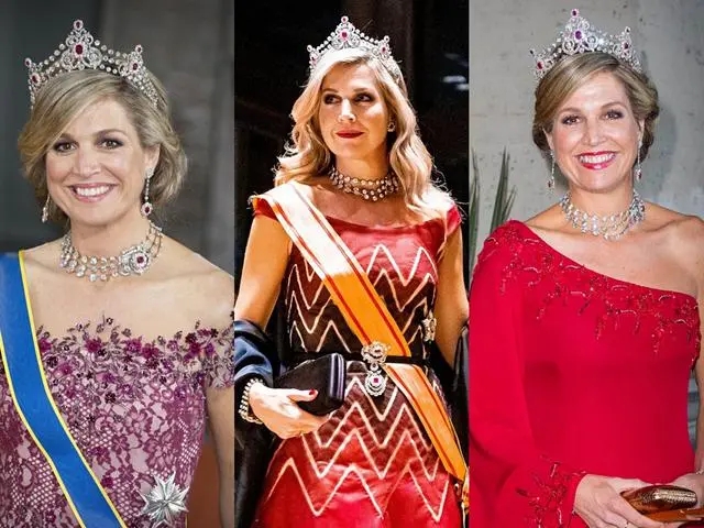 荷蘭王室的珠寶收藏很龐大,上面這頂由珠寶商Mellerio打造的紅寶石王冠是荷蘭王室眾多王冠中比較重要的一頂。我覺得這一頂紅寶石王冠造型非常美,現(xiàn)任荷蘭王后馬克西瑪很喜歡這頂王冠,她的許多重要時刻都是戴著這頂王冠出席:馬克西瑪成為王后之后發(fā)布的第一張官方肖像中就是佩戴這頂王冠,今年10月參加日本天皇的即位晚宴時也戴著王冠出席。